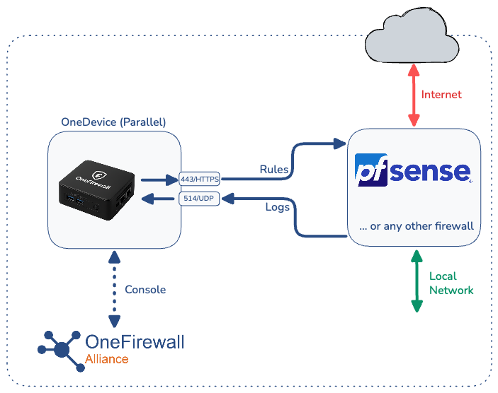 OneDevice Parallel, a product by OneFirewall, works alongside your existing firewall — whether it’s pfSense, FortiGate, Check Point, or Sophos. It monitors network activity and prevents cyberattacks in real time by analyzing logs and automatically updating security rules.