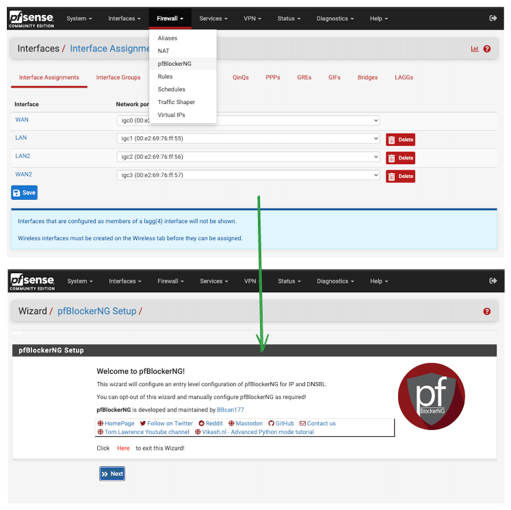 From pfSense Dashboard, go to System -> Package Manager and install pfBlockerNG if not already installed